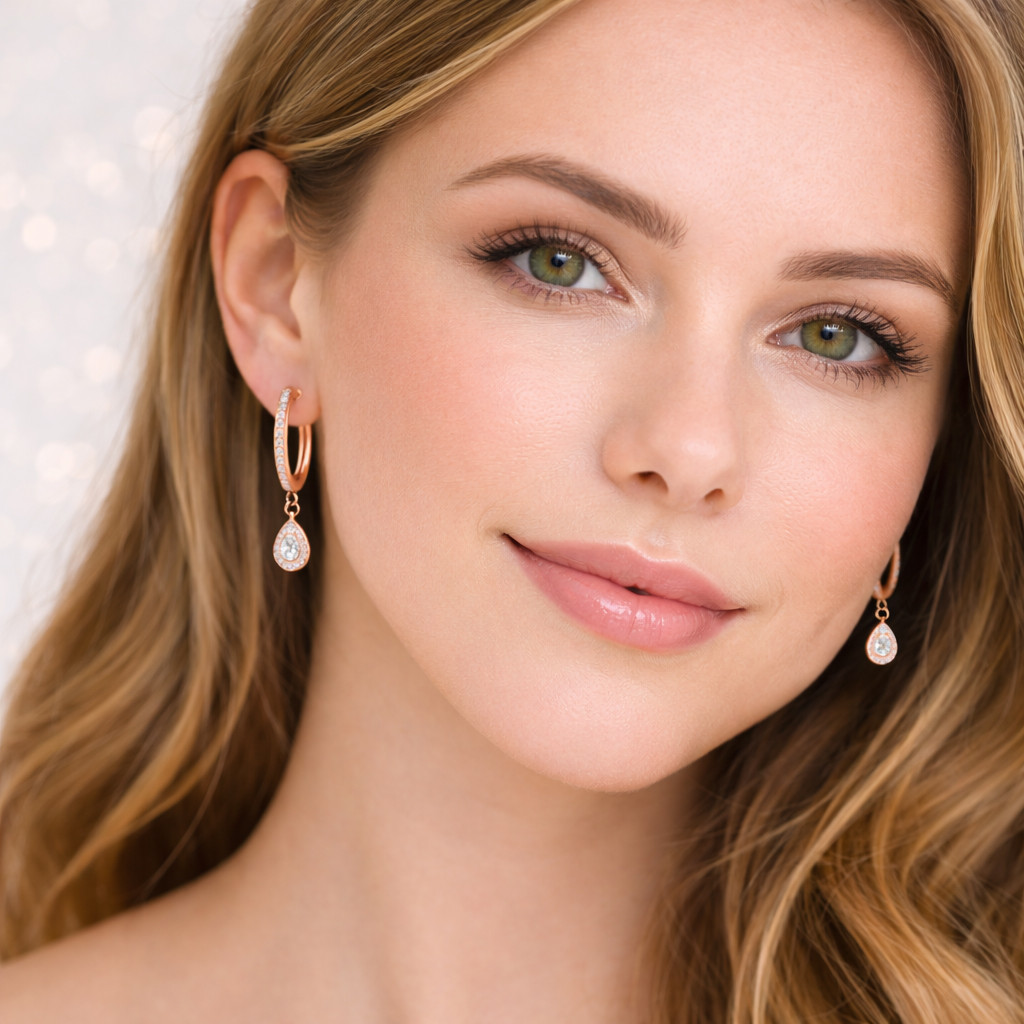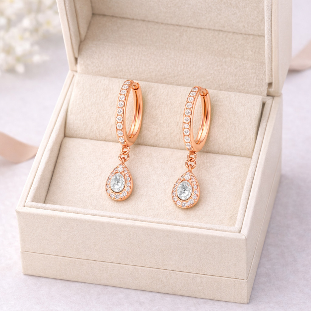 Graceful rose gold hoop earrings featuring a sparkling pavé diamond front and a delicate teardrop diamond drop. A lightweight, modern design perfect for everyday elegance and special occasions.