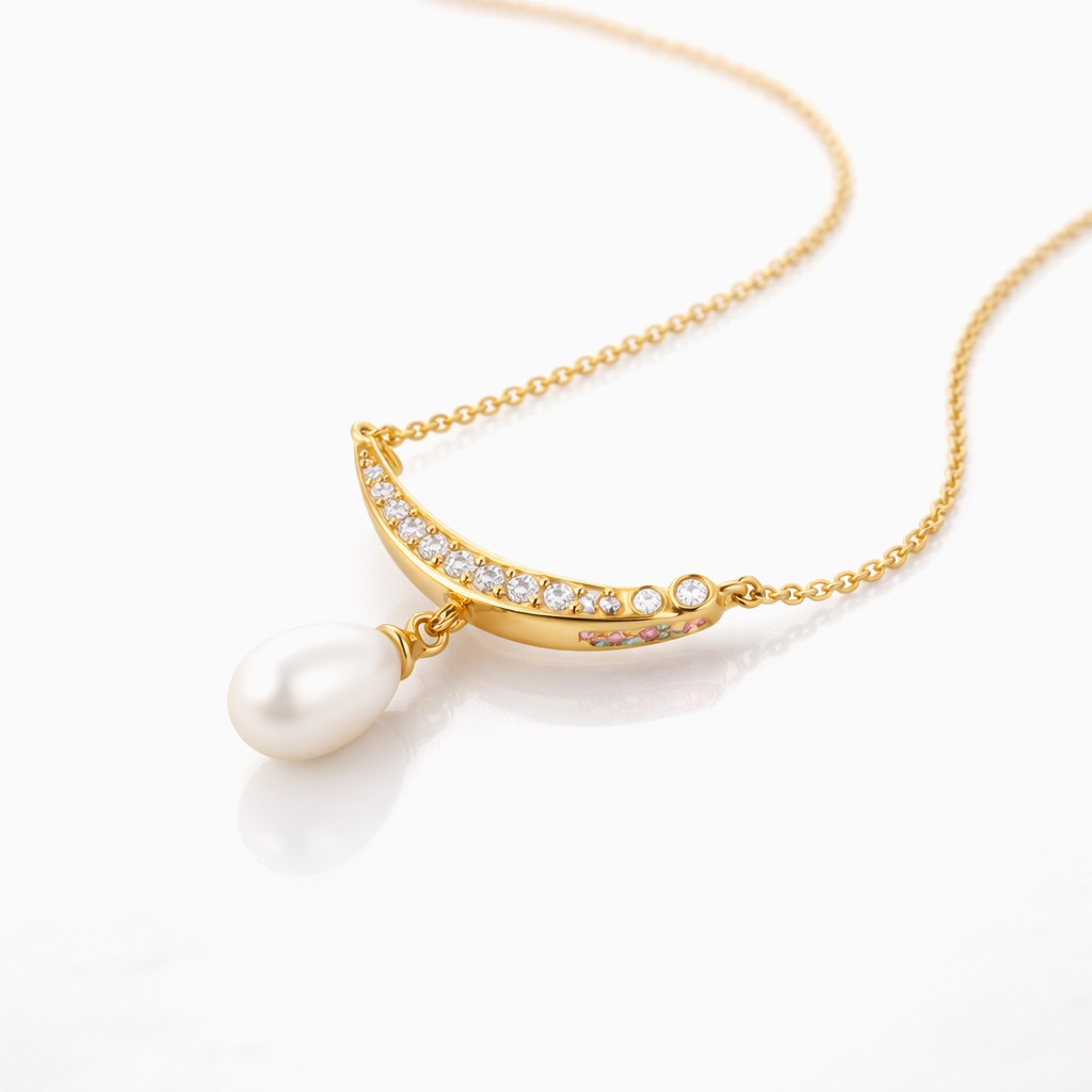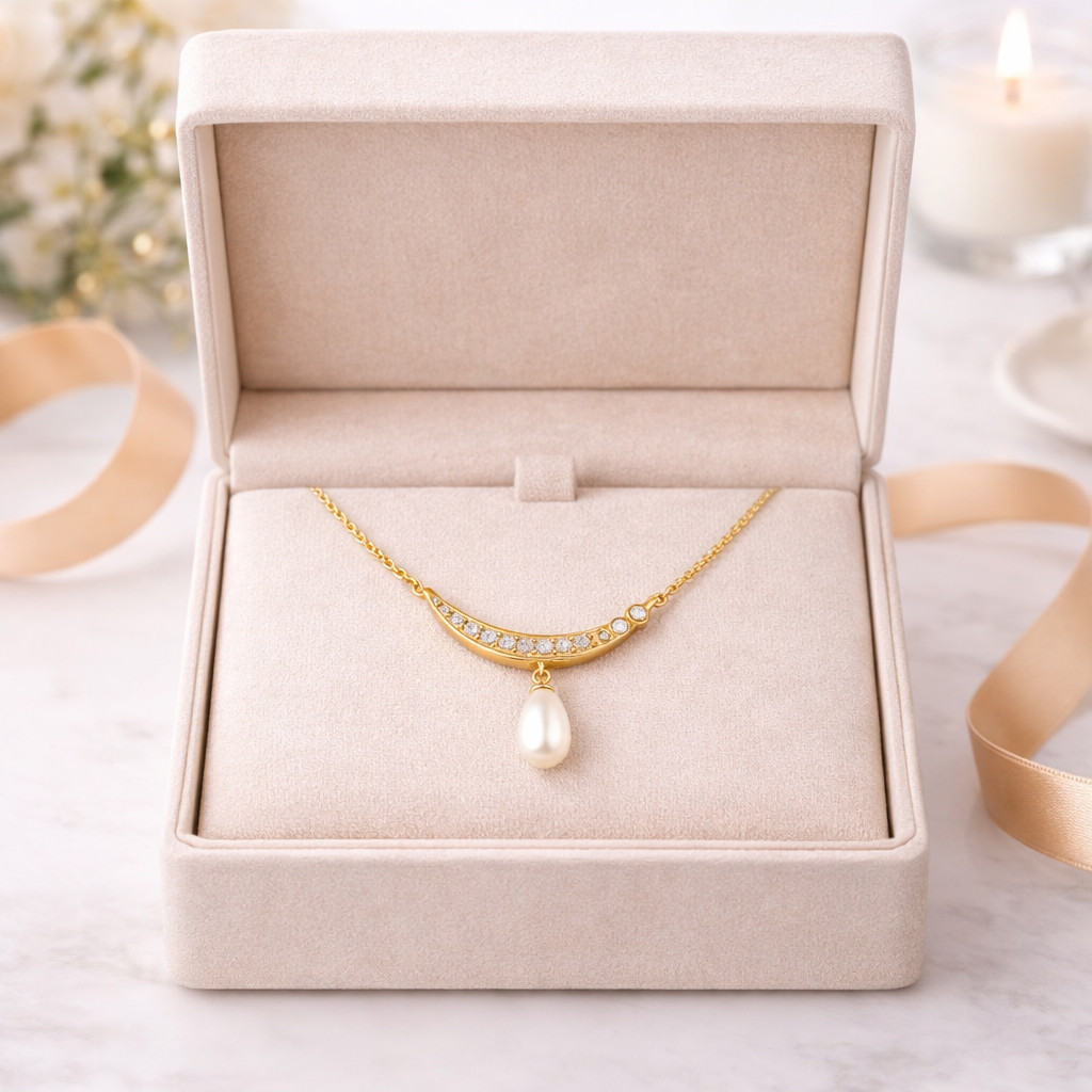 A refined gold curve necklace accented with shimmering diamonds and a graceful pearl drop, designed for timeless elegance and sophisticated gifting.