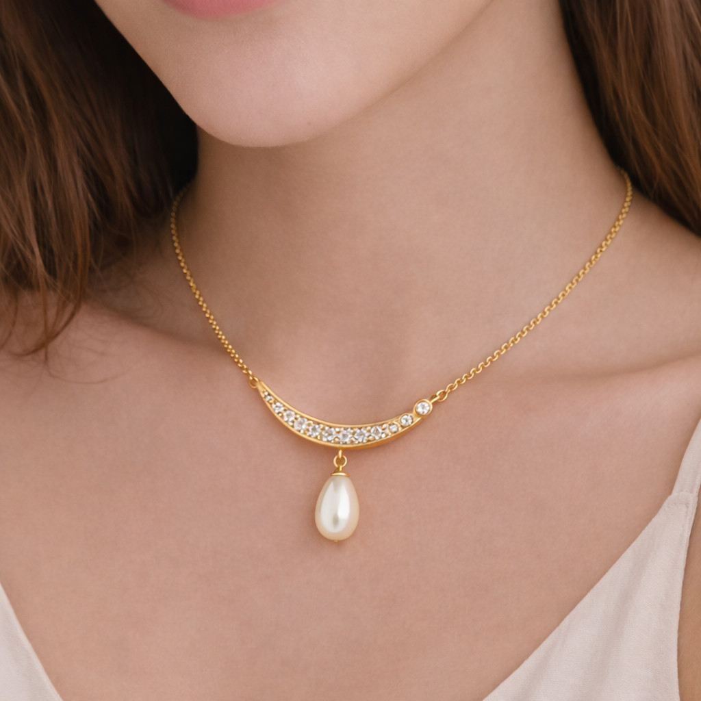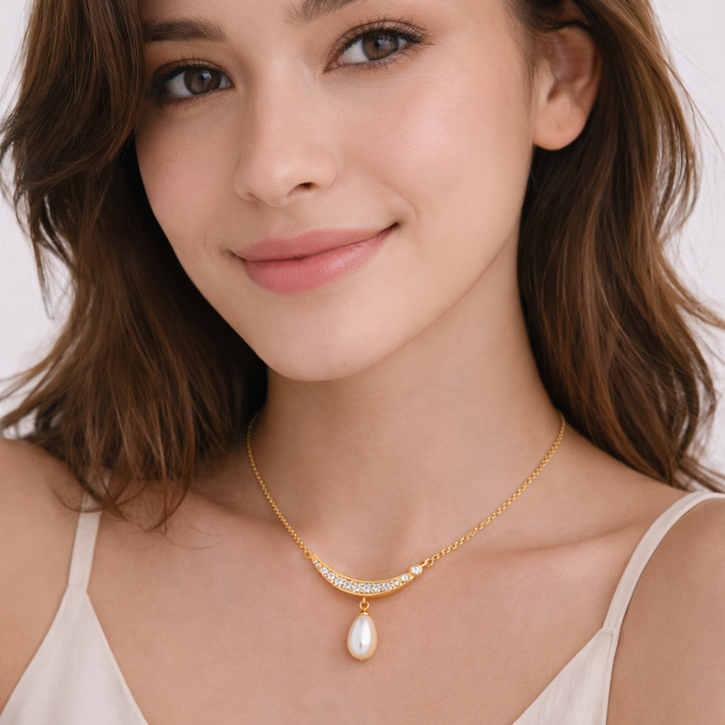 Elegant Gold Curve Diamond & Pearl Drop Necklace