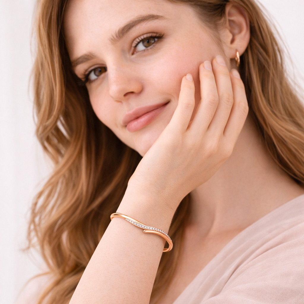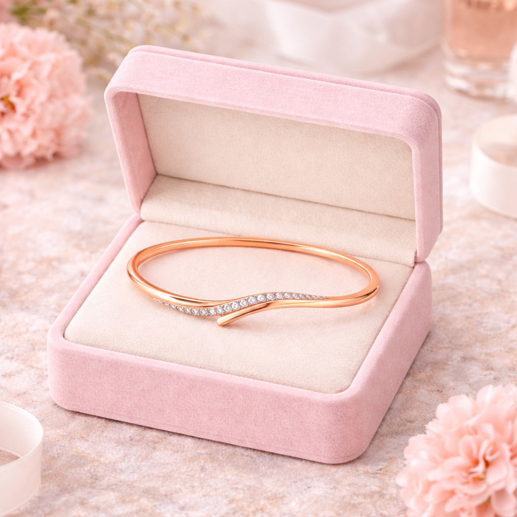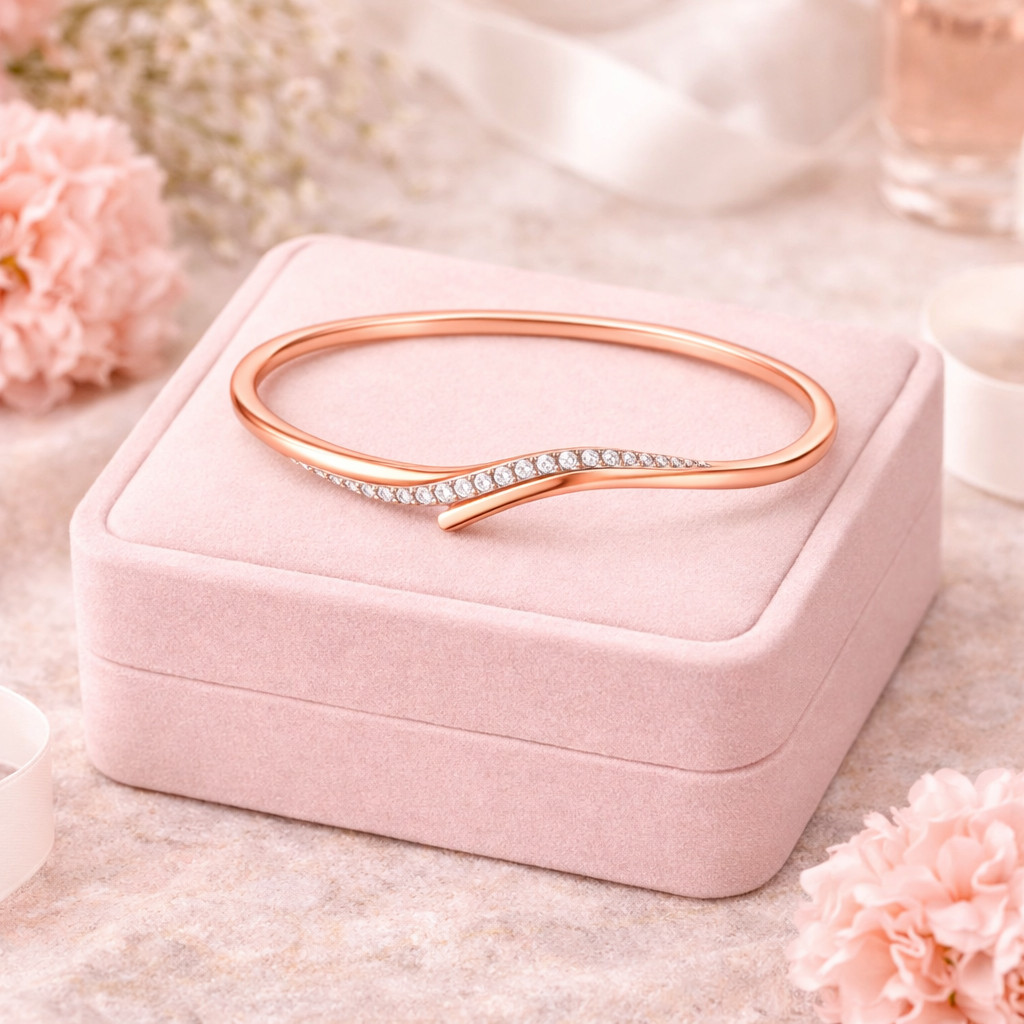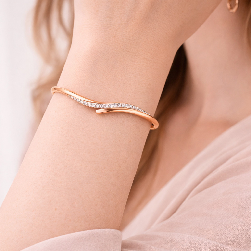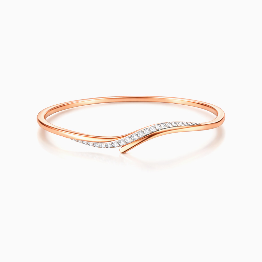 A sleek and modern rose gold open bangle bracelet featuring a graceful wave-inspired crossover design. Accented with shimmering pavé-set diamonds, this elegant piece blends contemporary style with timeless luxury—perfect for everyday wear or special occasions.