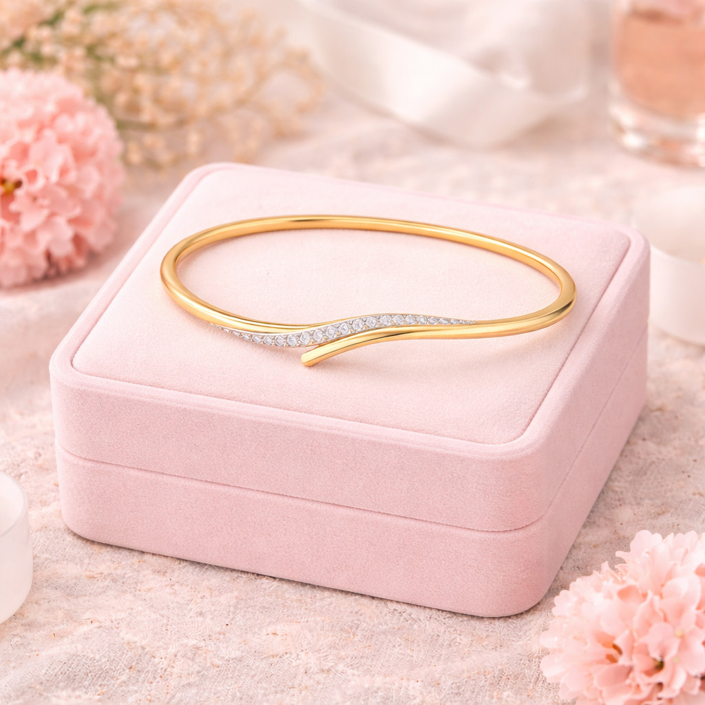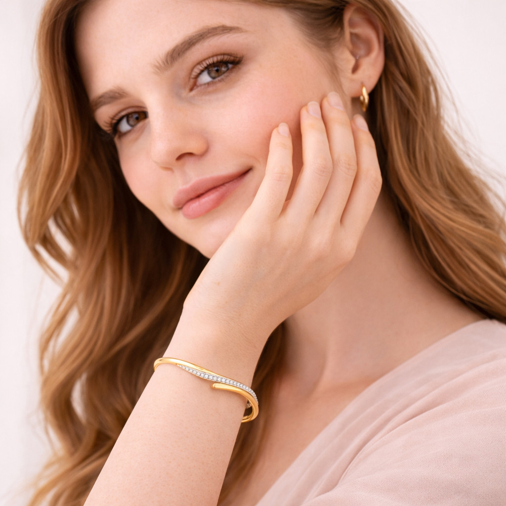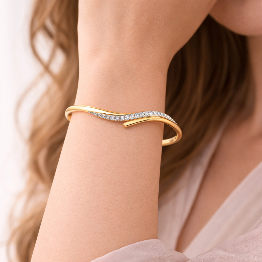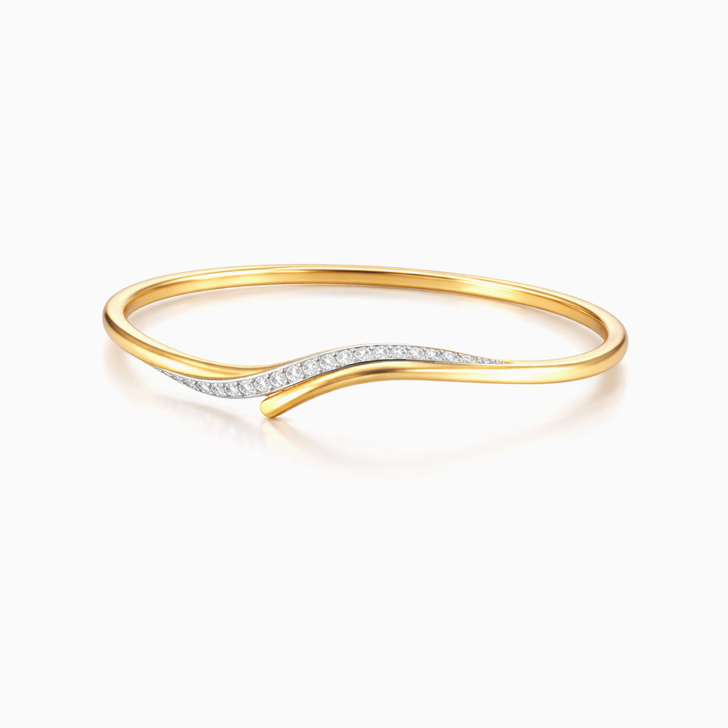 A refined open bangle bracelet crafted in polished yellow gold, featuring a graceful wave-inspired crossover design accented with sparkling pavé-set diamonds. Minimal, modern, and effortlessly luxurious—perfect for everyday elegance or special occasions.