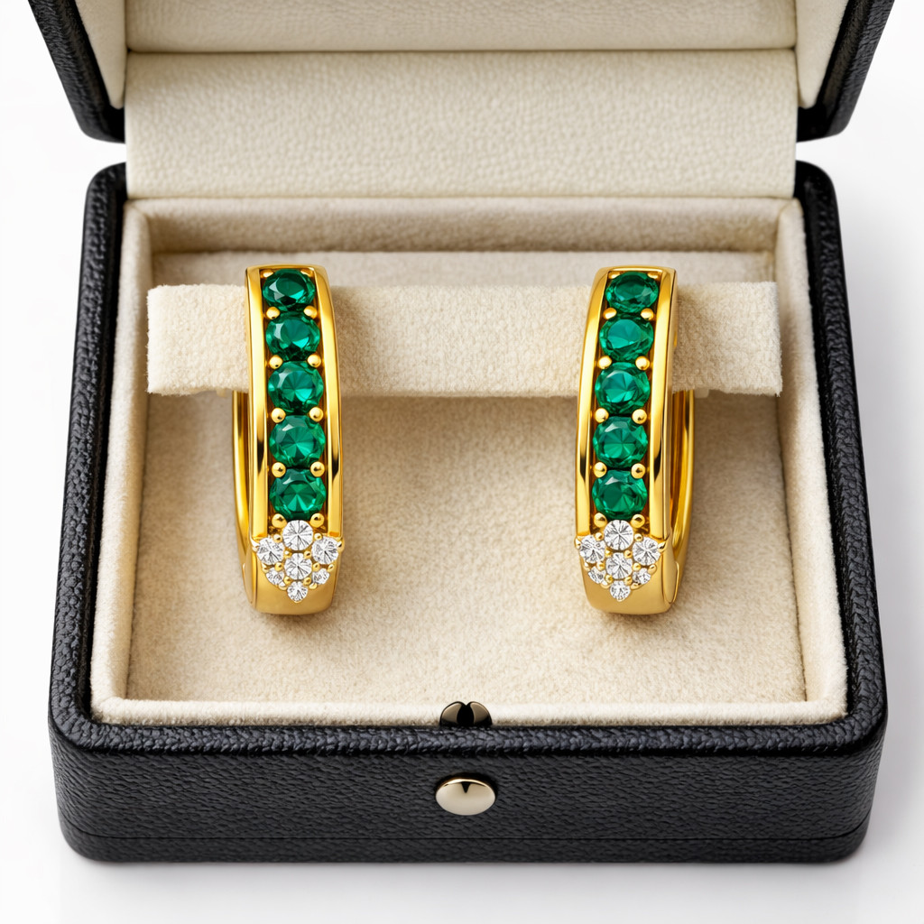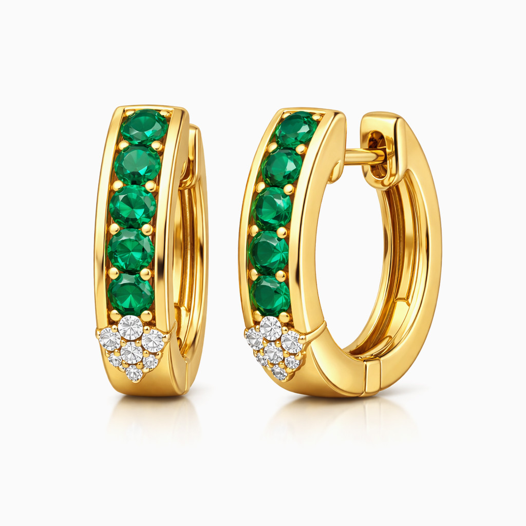 These exquisite hoop earrings are crafted in high-polish yellow gold and designed to make a subtle yet striking statement. The front face showcases a sleek channel of round-cut emerald-green gemstones, carefully set to enhance their rich color and brilliance. At the base, a delicate cluster of round brilliant-cut white diamonds adds a refined sparkle, elevating the overall design.