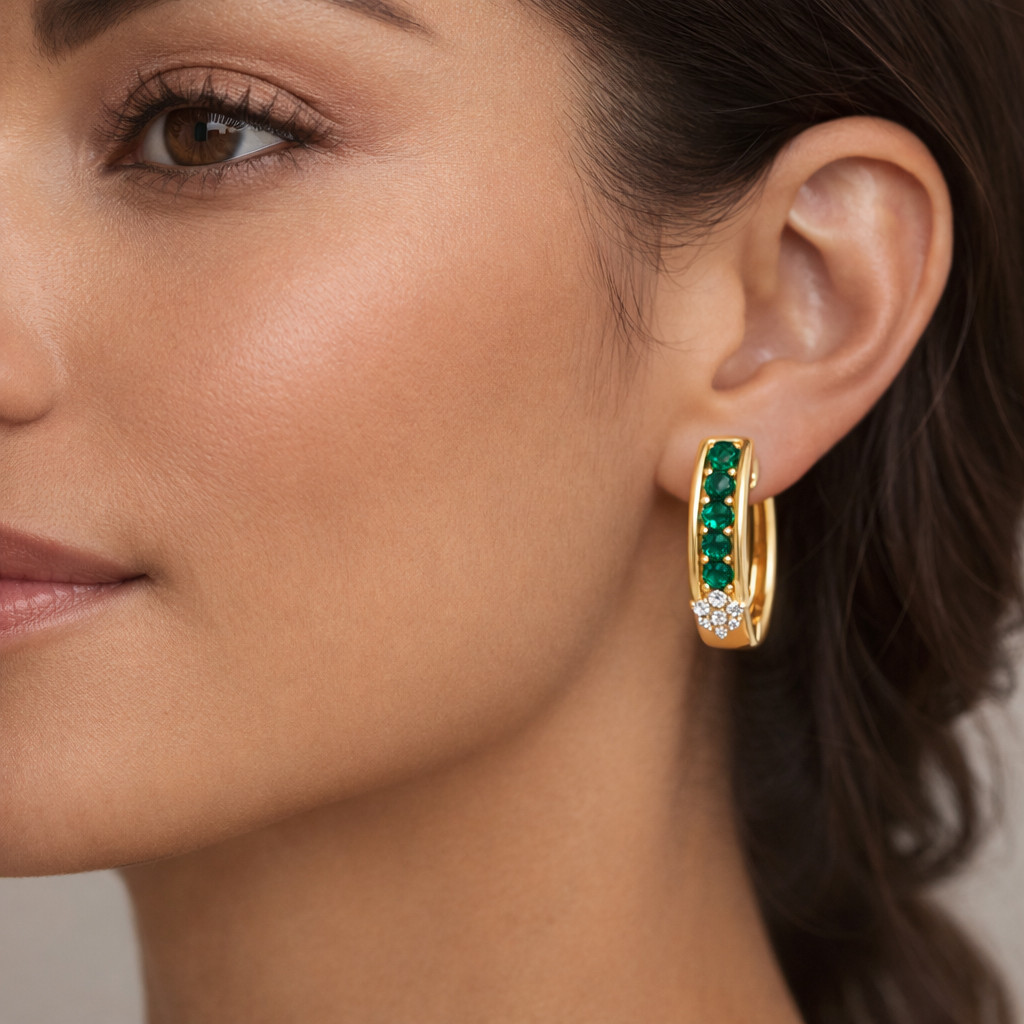 Elegant yellow gold hoop earrings featuring a vertical row of vivid emerald-green gemstones, finished with a sparkling diamond cluster accent. A refined design that blends everyday luxury with timeless sophistication.