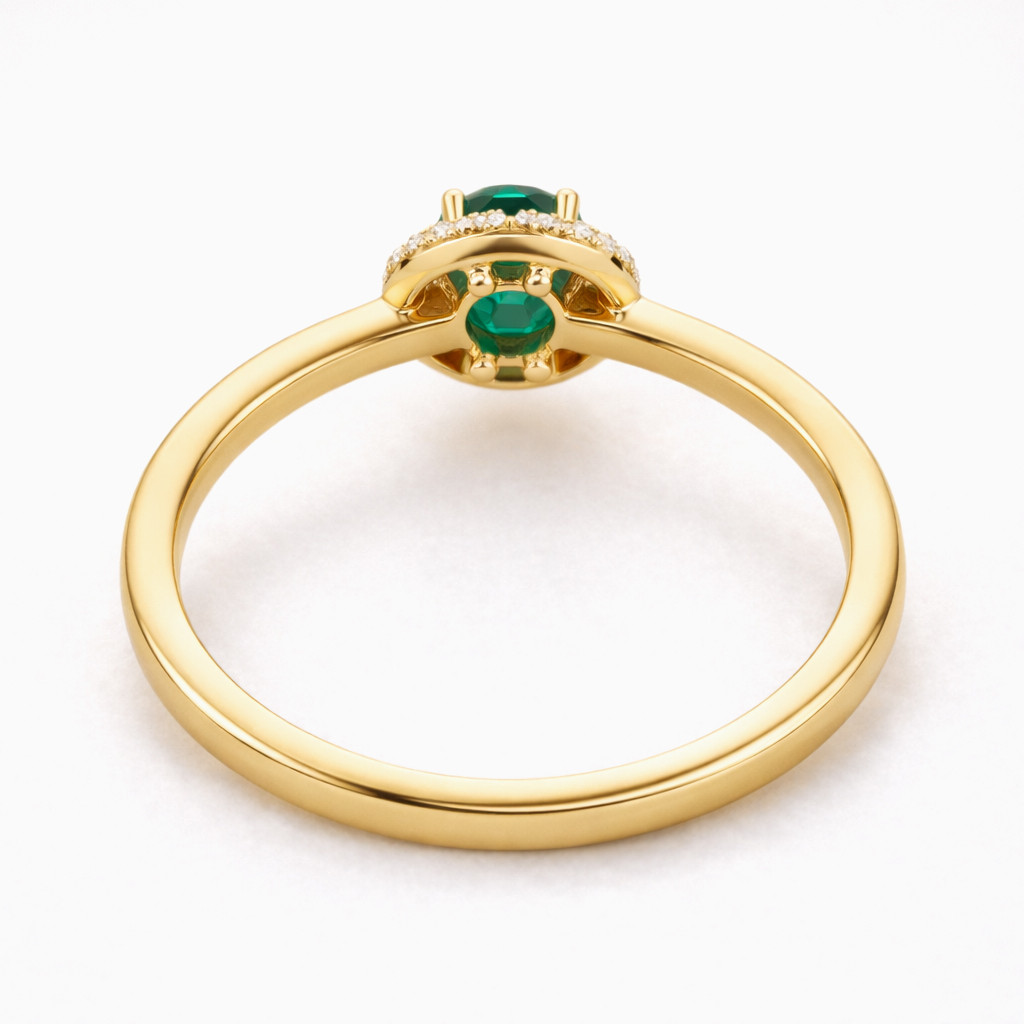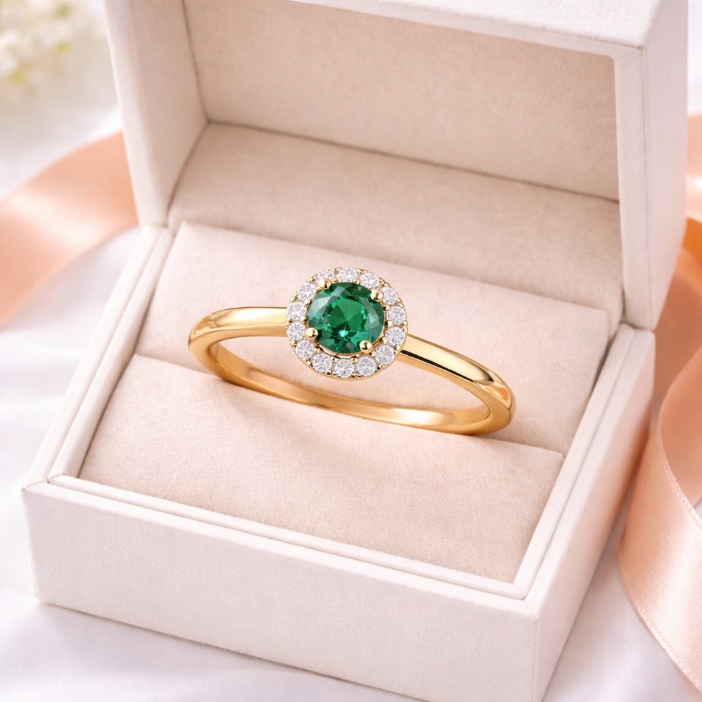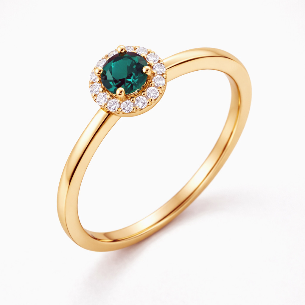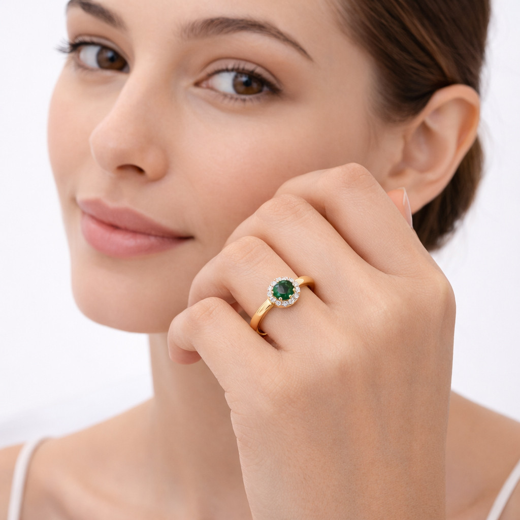 Crafted to celebrate timeless beauty, the Emerald Grace Diamond Halo Ring showcases a rich deep green emerald held in a refined prong setting at its center. Surrounding the emerald is a luminous halo of round brilliant-cut diamonds, enhancing the gemstone’s depth and brilliance from every angle.