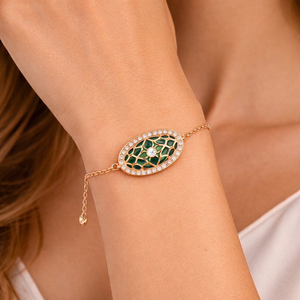 A refined rose gold bracelet featuring an elegant oval centerpiece with rich green enamel lattice detailing, framed by sparkling pavé diamonds. Designed for graceful everyday luxury and special occasions alike.