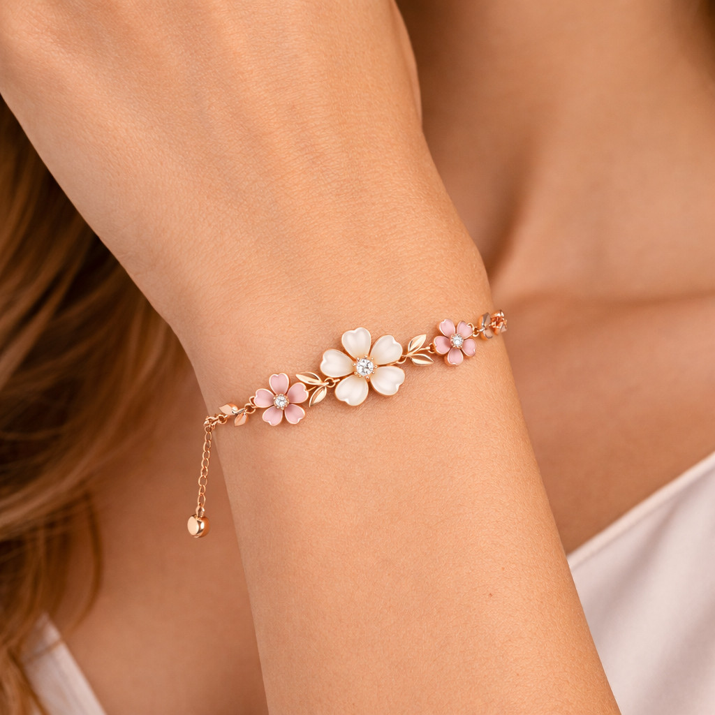A graceful rose gold bracelet adorned with delicate floral motifs, featuring white and blush pink enamel petals highlighted by sparkling diamond centers. Lightweight, feminine, and inspired by nature, this bracelet is perfect for everyday elegance and special moments.