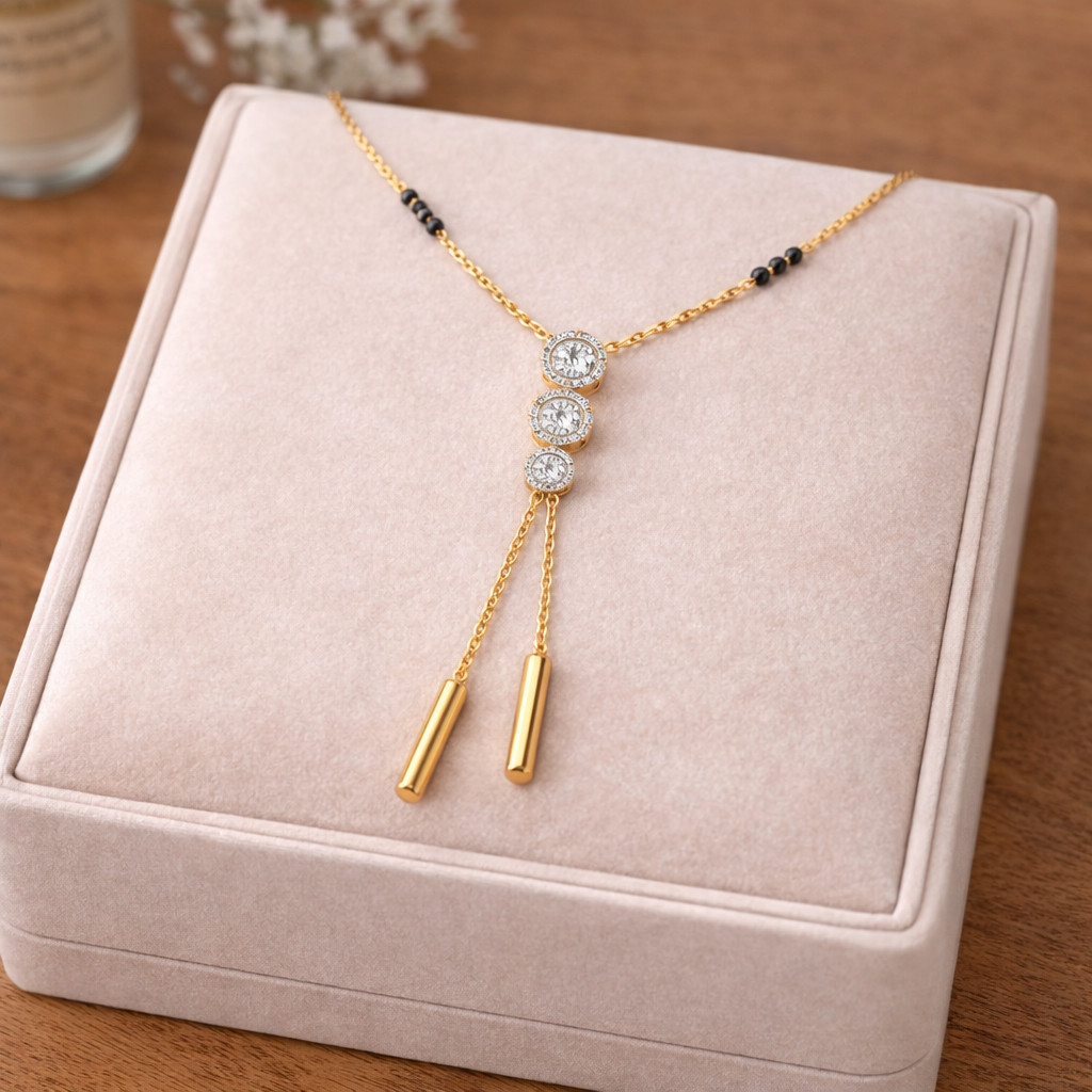 Redefine tradition with this Gold Diamond Drop Mangalsutra Necklace, crafted for the modern woman who values elegance with meaning. The design showcases three diamond-studded circular motifs arranged vertically, creating a refined focal point.