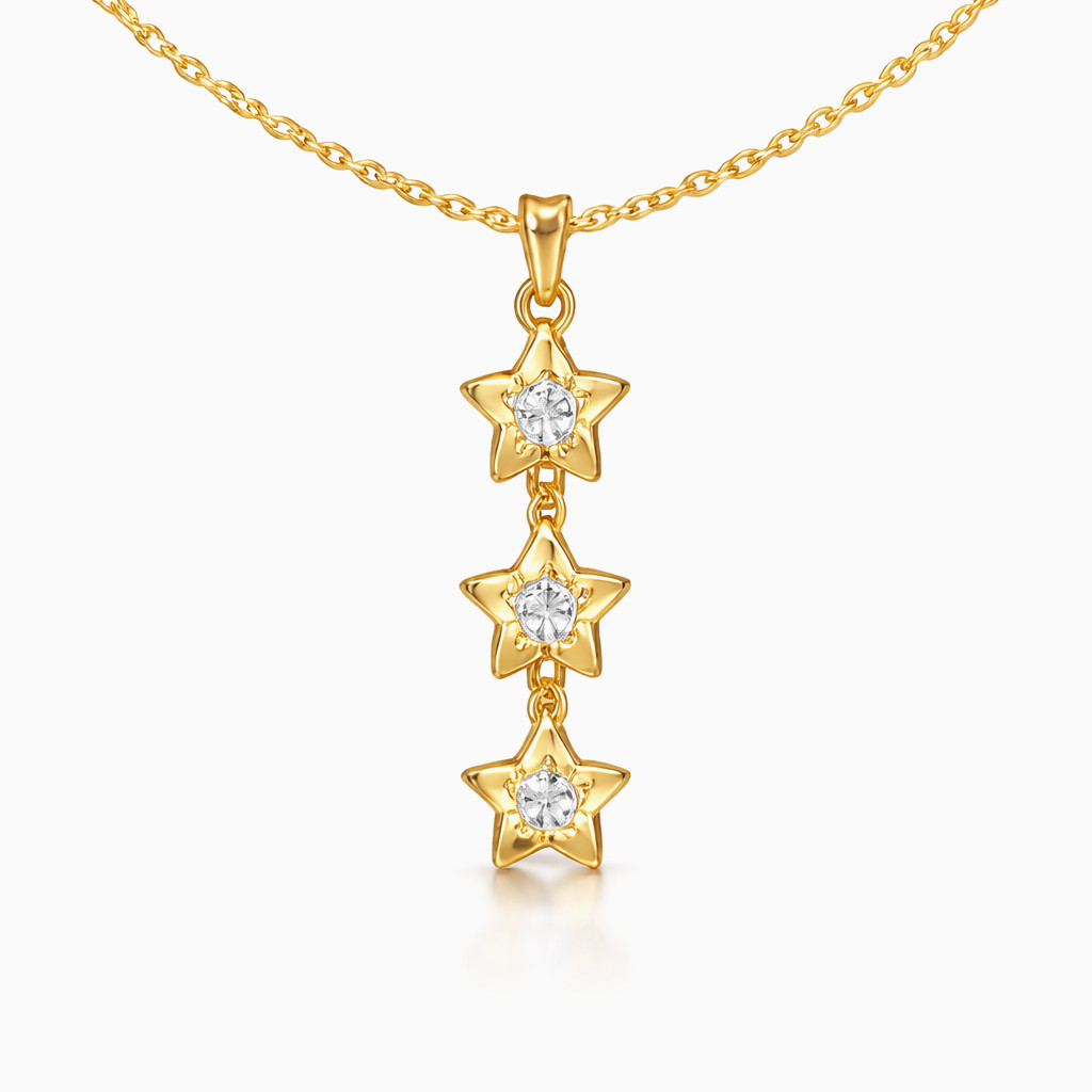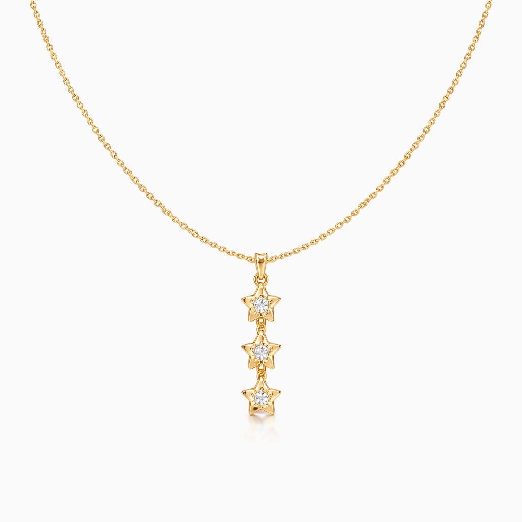 Crafted in polished yellow gold, this refined necklace showcases a graceful vertical drop pendant composed of three beautifully sculpted star motifs. At the heart of each star sits a tiny round brilliant-cut diamond, creating a subtle cascading sparkle that catches the light with every movement.