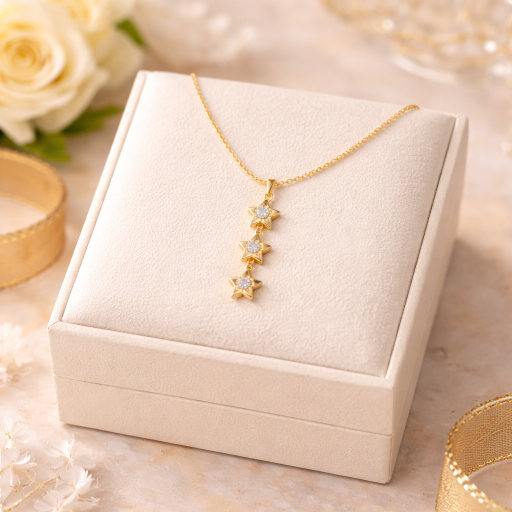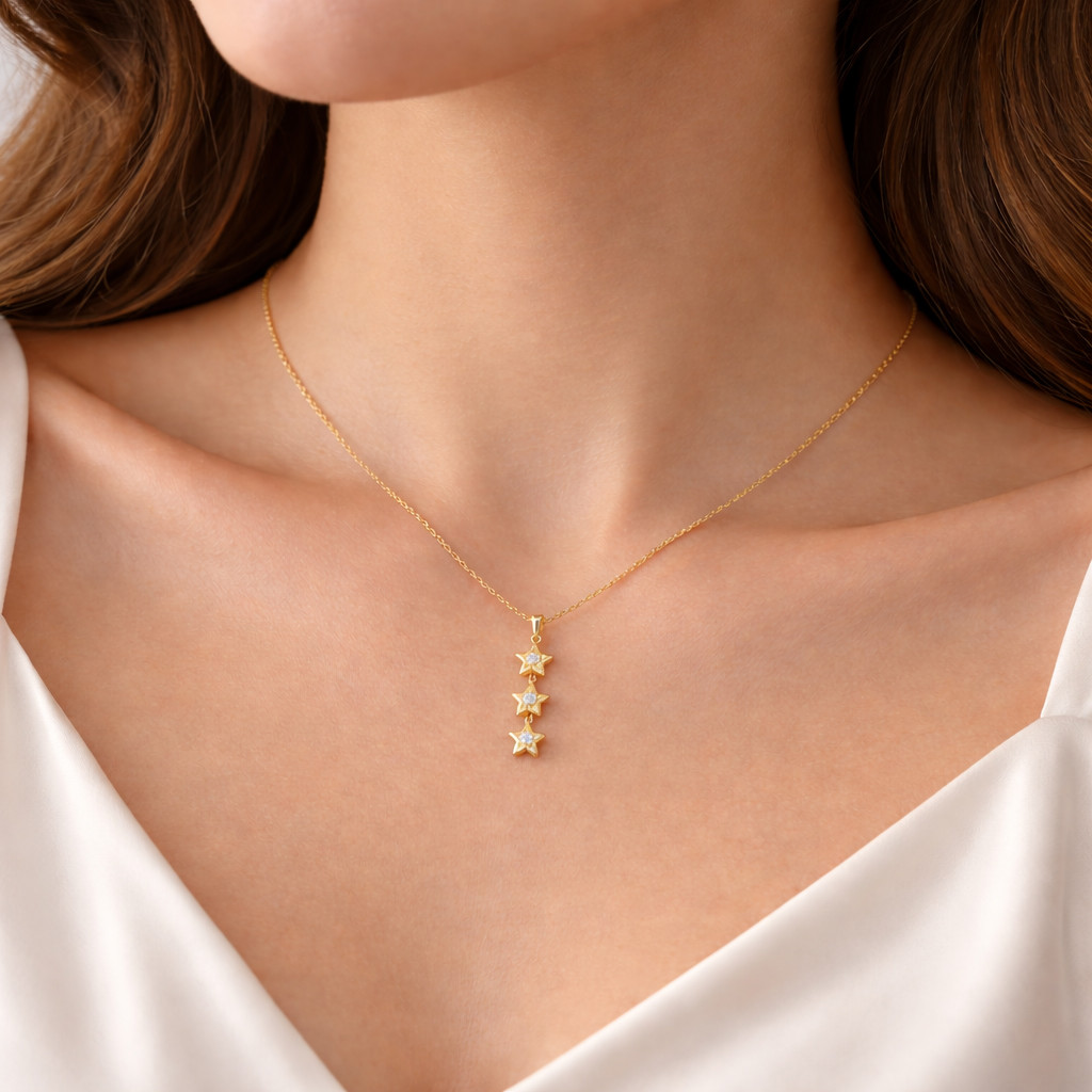 A delicate and elegant yellow gold necklace featuring a vertical drop pendant with three star-shaped motifs, each accented by a sparkling diamond. Designed for everyday luxury, this minimalist piece adds a soft celestial charm to any look.